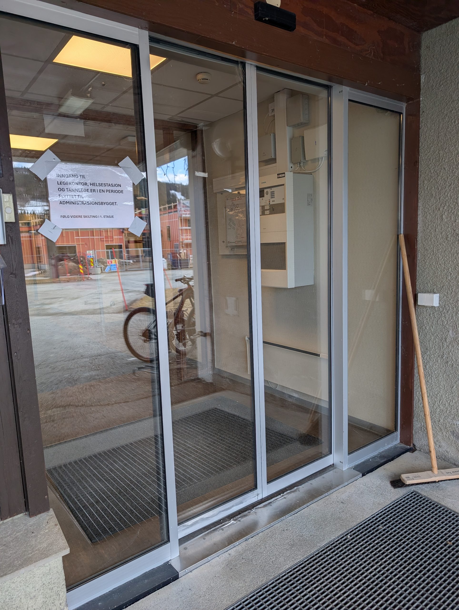 Inngangen til legekontor, helsestasjon og tannlegen er via hovedinngangen til administrasjonsbygget i en periode pga utskifting av inngangsdør.